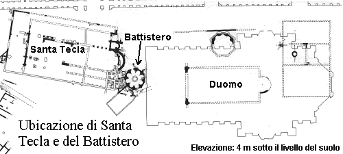 La pianta mostra l’attuale ubicazione della Catteedrale (sulla detra) e l’ubicazione della pi antica Santa Tecla.